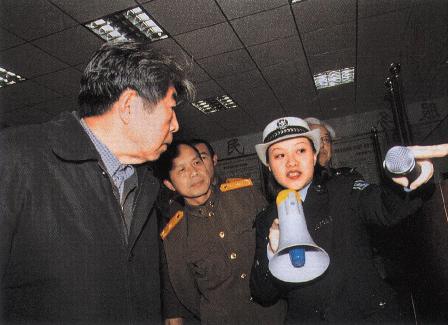 (09-3)中国新闻摄影学会执行会长舒野、解放军报高级记者江志顺少将等在襄樊市交警支队参观采访。
