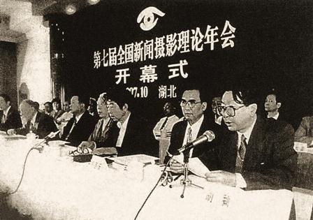 (07-2)由全国报纸总编辑、摄影记者、图片编辑参加的第七届全国新闻摄影理论年会,1997年10月12日至18日在武汉隆重举行。穆青同志出席了开幕式?!赌虑嗌阌罢埂芬餐痹谖浜嚎?。曲河摄
