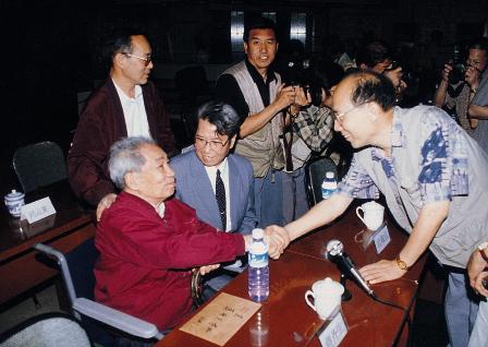 (04-1)在1990年11月5日于武汉召开的第四届全国新闻摄影理论年会上,我国第一位中共党员摄影记者罗光达(前左三)和中国新闻摄影学会会长蒋齐生(前左二),是中青年代表们采访的对象。胡谋摄