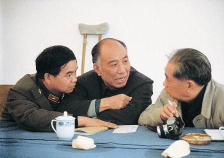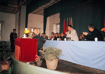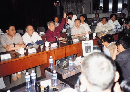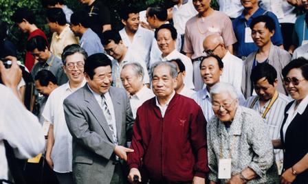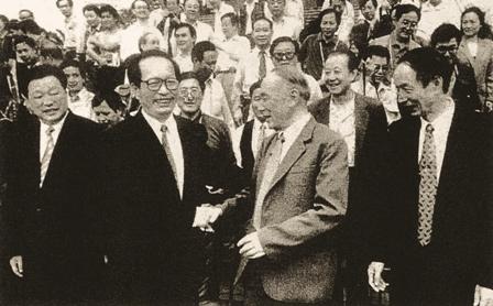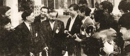 (07-1)中共湖北省委书记贾士杰同志(左二)看望穆青等与会代表。 曲河摄