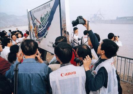 (07-3)参加第七届全国新闻摄影理论年会的与会者,1997年10月16日到世界最大的水利工程长江三峡工地采访,时距举世瞩目的大江截流只有22天。 舒泽金摄