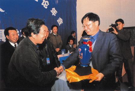 (09-7)中国新闻摄影学会向中共襄樊市委、市政府、襄樊日报社、南漳县委、县政府颁发了组织奖,以致谢意。这是学会副会长蒋铎代表学会给襄樊日报社颁奖。