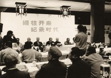 (13-6)蒋老讲话:“为建立有中国特色的新闻摄影而奋斗!”左起:孙忠同、穆青、蒋齐生、范敬宜、王晨、张芬之等。