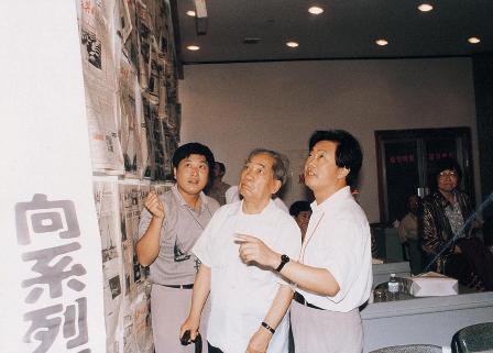 (04-3)中国新闻摄影学会创始人蒋齐生抱病出席了第四届全国报纸总编辑新闻摄影研讨会。他在襄樊日报总编辑陈心安(右)、总编辑助理陶宜军陪同下,参观在这次会议照片版面评选中获“创新奖”的襄樊日报的好版面。连相如摄