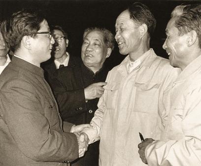 (04-1)1985年度全国新闻摄影作品评选在上海举行时,时任上海市委副书记黄菊同志到宾馆看望了全体评委。并同蒋齐生、徐大刚(右一)、铁矛(右二)等同志一一握手。 贺延光摄
