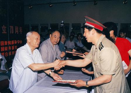 在纪念中国共产党成立70周年全国新闻摄影展览开幕式上,对第四届全国新闻摄影理论年会获奖论文和第十届全国新闻摄影作品评选获奖作品同时颁奖。部队摄影工作者舒泽金论文获“新闻摄影学术成果奖”、摄影作品获 “银牌奖”,高兴地领奖,老前辈连连夸奖“有军人样子,一下夺两项大奖??上部珊兀】上部珊?!”陈义摄