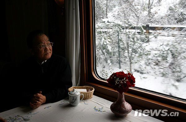 2008年2月2日,国务院总理温家宝从湖南长沙紧急赶往郴州重灾区指挥抗灾救灾工作。在火车上,他望着窗外的积雪,神情凝重。新华社记者 姚大伟摄