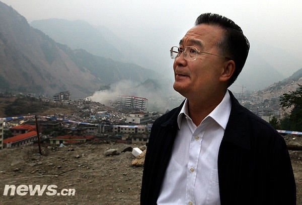 2008年5月22日,温家宝总理来到四川北川县城外的一块高地上,察看这座在地震中遭受严重破坏的城镇。准备离开时,他忽然转过身,挥起右手和这座成为废墟的县城告别。随后,他默默地环视县城,神情凝重。新华社记者 姚大伟摄