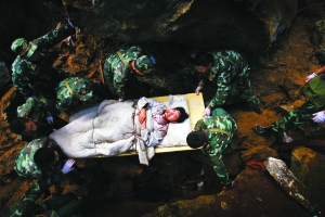 走出北川  突发类新闻  一等奖  《杭州日报》  记者陈庆港  “地震中有很多记者在前方拍摄,也有太多震撼人的照片。这张照片最打动人的可能还是它所传递的精神:8名军人在乱石丛中,在随时可能塌方的危险下抢救伤者?!?/sup>