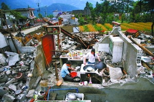 四川地震  幸存者  一般类新闻  单幅二等奖  《深圳晚报》  记者赵青    “这张照片是我徒步进入北川后拍摄的,那天傍晚时分,看到一对男女在做晚饭,我非常激动。这一场景让人看到了希望?!?/sup>