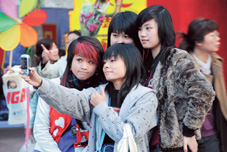 2006年,在广州迎春花市的牌楼前用手机自拍留念的少女们。她们的着装心态是:“只要我喜欢,没有什么不可以”。Fotoe 供图