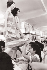 1984年,广州第一次“美在花城”时装展销会上,一名女青年撩起模特儿的裙子里里外外看了个仔细。Fotoe 供图