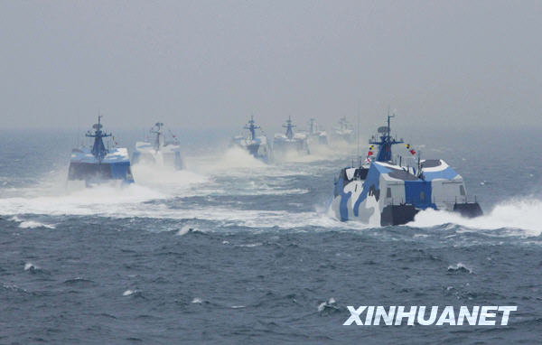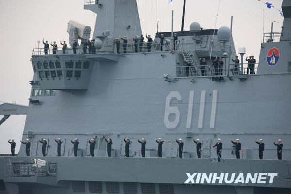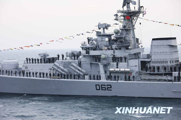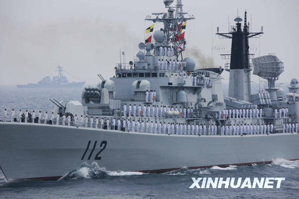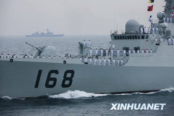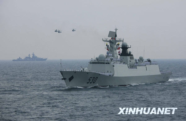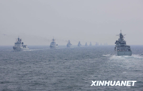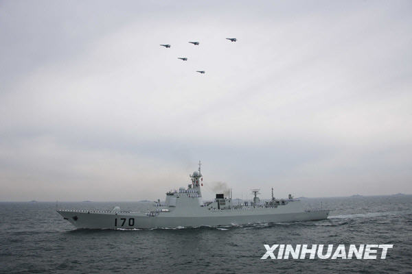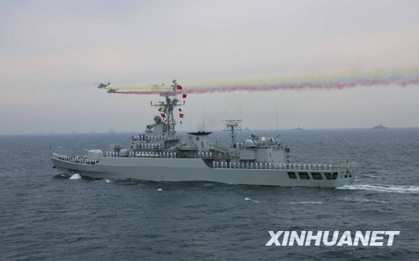 当日下午,为纪念中国人民解放军海军成立60周年而举行的海上阅兵在青岛附近黄海海域举行。海上检阅式分两个阶段,第一阶段为海上分列式,检阅中国海军的舰艇和飞机;第二阶段为海上阅兵式,检阅来自14个国家的21艘舰艇。新华社记者查春明摄