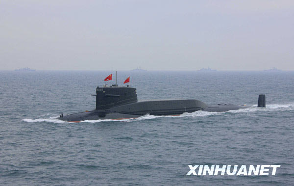 4月23日,中国海军核动力潜艇在接受检阅。新华社记者查春明摄