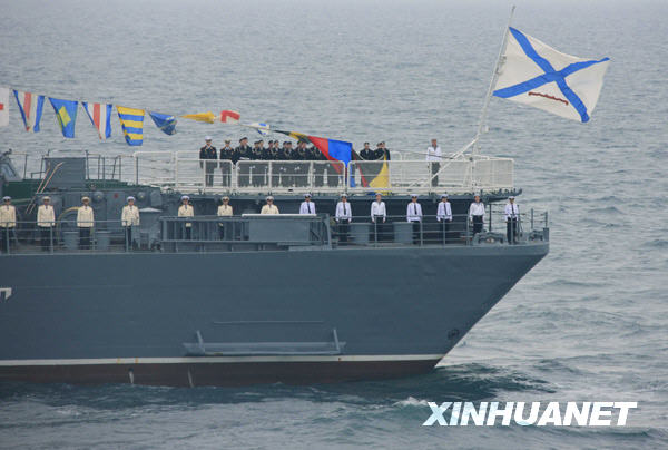 4月23日,俄罗斯“瓦良格”号导弹巡洋舰参加阅兵式。新华社记者查春明摄