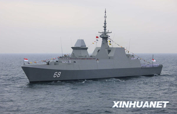 4月23日,新加坡“可畏”号导弹护卫舰参加海上阅兵式。新华社记者查春明摄