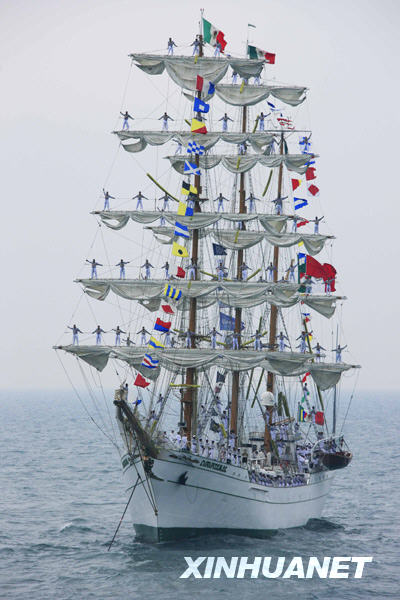 4月23日,墨西哥“夸乌特莫克”风帆训练舰参加海上阅兵式。新华社记者查春明摄