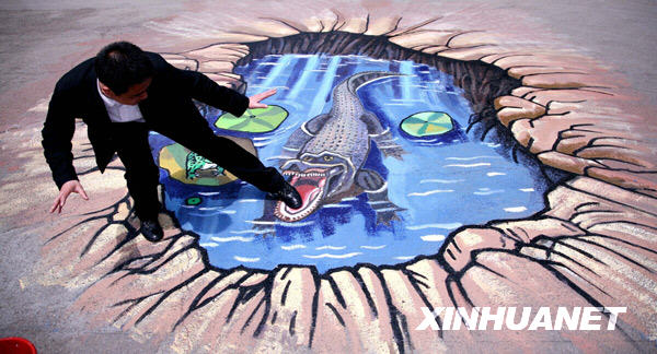 近日,南京玄武湖公园的地面上出现了30多幅三维空间立体画。游人只要站在这些立体画的特定位置,按照特定角度与画作合影,就能拍出立体感很强的照片。新华社发(王新 摄)