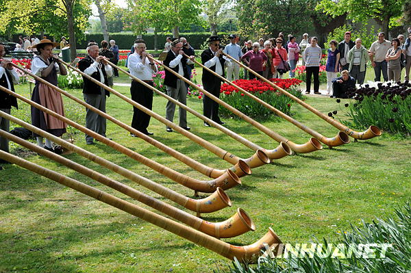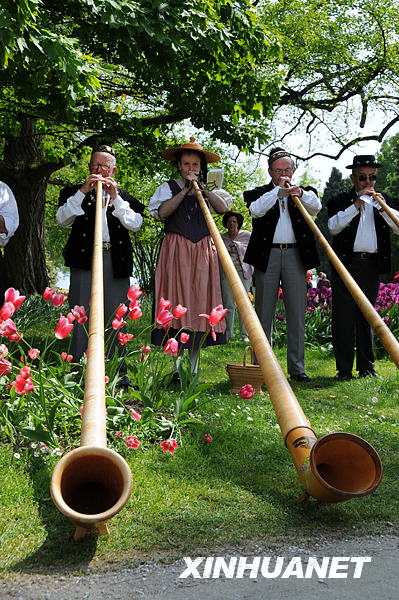 这是在瑞士莫尔日市举办的郁金香节上进行的阿尔卑斯长号表演(2009年5月3日摄)。新华社记者杨京德