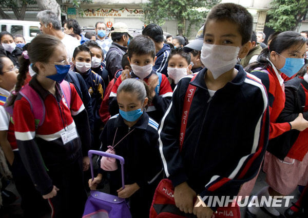 5月11日,在墨西哥首都墨西哥城,一些戴着口罩的小学生准备进入学校上课。当日,因受到甲型H1N1流感疫情影响停课的墨西哥中小学和学龄前教育机构开始复课。新华社/路透