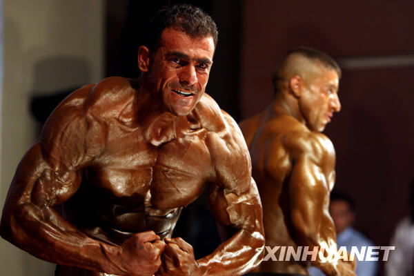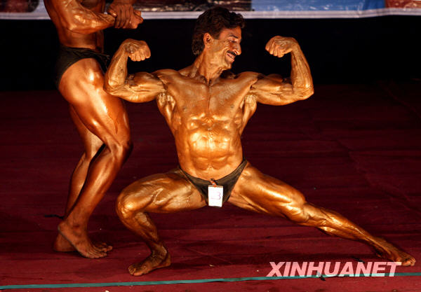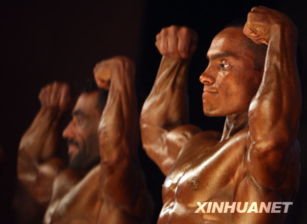 6月2日,一名健美运动员在比赛中。当日,一场健美比赛在阿富汗首都喀布尔举行,阿富汗国家健美队也将在本次比赛中挑选队员。新华社发(扎比摄)