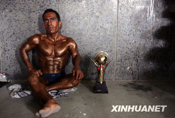 6月2日,获得金奖的一名残疾运动员比赛后坐在自己的奖杯旁。当日,一场健美比赛在阿富汗首都喀布尔举行,阿富汗国家健美队也将在本次比赛中挑选队员。新华社发(扎比摄)