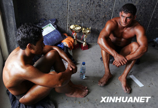 6月2日,一名健美运动员在赛前热身。当日,一场健美比赛在阿富汗首都喀布尔举行,阿富汗国家健美队也将在本次比赛中挑选队员。新华社发(扎比摄)