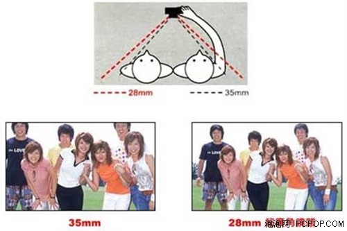 由于普通的35mm只能达到62度,而28mm的广角视野要比数码相机上最常见的35mm、38mm的广角更宽,因为28mm广角视野是76度视角,因此可以产生很独特的视觉效应,容纳更宽广的场景。对于旅游特别是拍摄宏伟的风景、建筑或在合影时,广角镜头的好处显而易见:可以拍摄更加宽广的风景,对于展现风光美态非常合适,用广角镜头产生的画面变形,令到前景的物体得到夸张地放大,更加突出前景物体,给予视觉上强烈的冲击。这也是为什么越来越多的消费者看好28mm广角数码相机的原因。