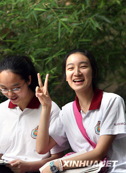 6月7日,一等待进入考场的考生自信地作出“胜利”手势。当日,2009年全国普通高校招生全国统一考试开始进行。 新华社记者 刘颖 摄