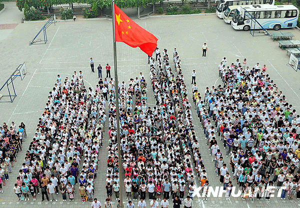 6月7日,河南省嵩县实验中学参加高考的学生在参加升旗仪式。当日,2009年全国普通高校招生全国统一考试开始进行。 新华社记者王颂摄