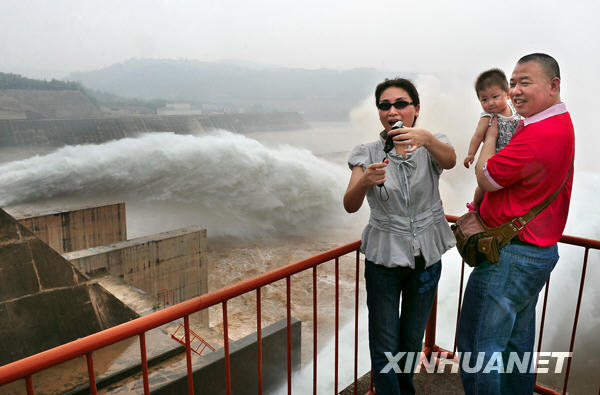 6月19日,在黄河小浪底大坝出水口顶部,来此游览的一家三口准备拍照留念。新华社记者 王颂摄