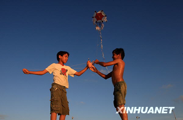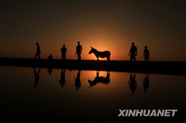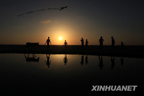 6月21日日落时分,几名巴勒斯坦人在加沙城海边流连玩耍,不忍归去。新华社记者 纳赛尔 摄