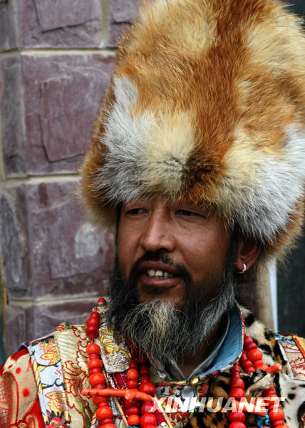 香格里拉街头一位身着藏式豪华盛装的康巴汉子(2007年9月摄)。新华社记者陈海宁摄