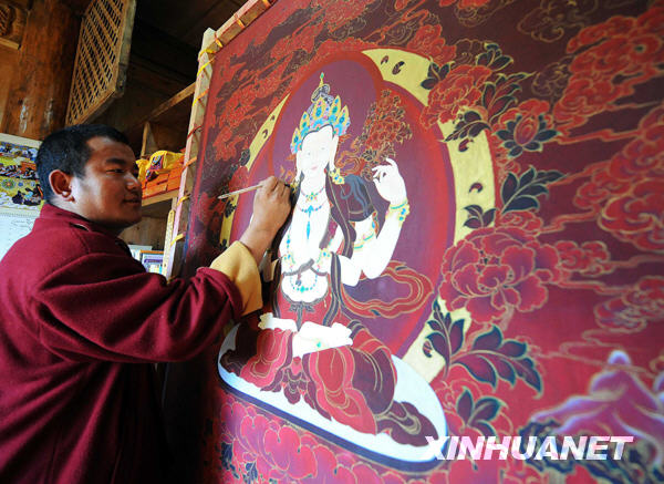 香格里拉县唐卡艺人洛桑克主在创作唐卡(2008年10月11日摄)。 新华社记者蔺以光摄