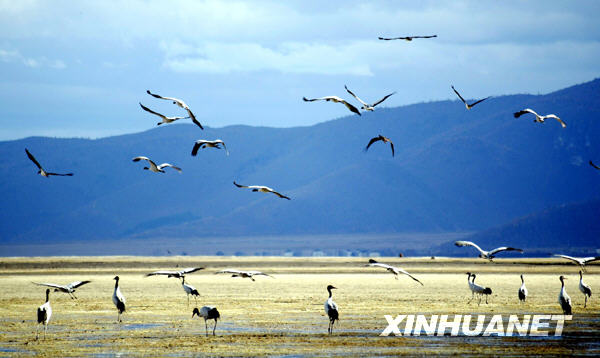 黑颈鹤在香格里拉县纳帕海自然?;で芟ⅲ?006年11月6日摄)。新华社记者秦晴摄