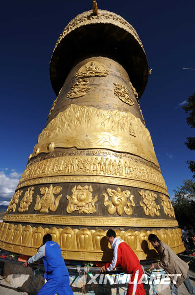 游客在香格里拉县建塘镇独克宗古城推巨型转经筒(2008年10月10日摄)。 这个巨型转经筒高21米,总重60吨,需要4个人一起推才能转得动。新华社记者蔺以光摄