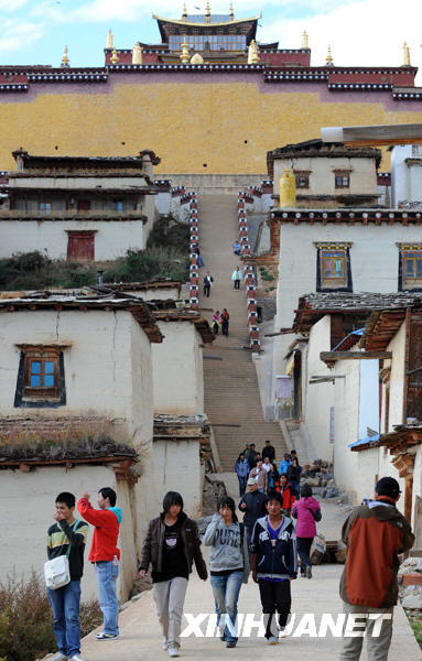 游客在香格里拉松赞林寺游览(2008年10月11日摄)。 新华社记者蔺以光摄