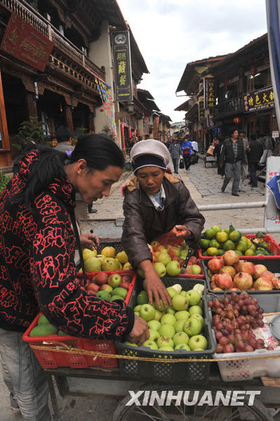 香格里拉建塘镇独克宗古城的水果摊(2009年8月20日摄)。新华社记者陈海宁摄