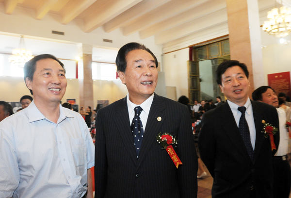 3. 《人民画报》社长兼总编辑徐步(左)陪同中宣部副部长蔡名照(右)、中国外文出版发行事业局局长周明伟(中)参观《人民画报》图片藏画展。
