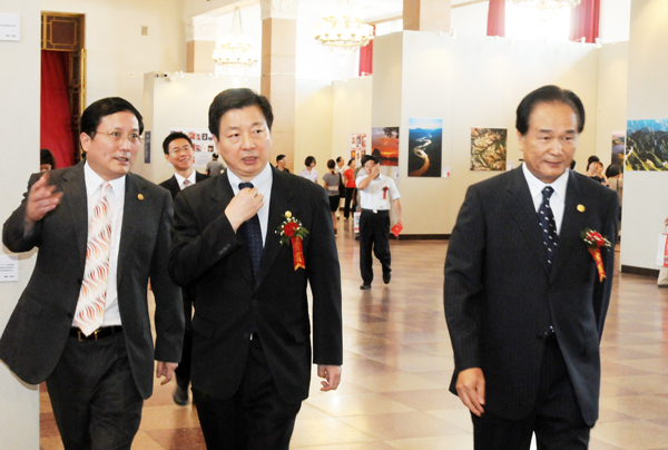 2. 中宣部副部长蔡名照(中)在中国外文出版发行事业局局长周明伟(右)陪同下参观《人民画报》图片精品展,左为中国新闻摄影学会执行主席赵德润。
