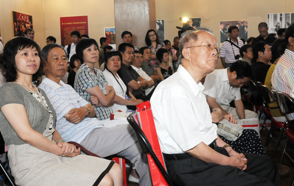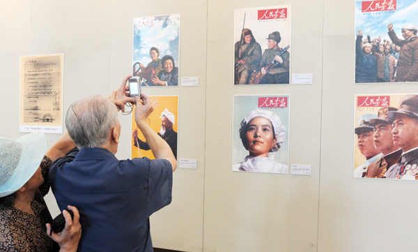 6. 出席《人民画报》创刊60周年纪念活动的老新闻工作者在拍摄《人民画报》图片展的经典照片。