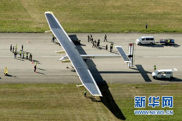 7月8日,太阳能飞机“太阳驱动”在首次昼夜试飞成功后停在瑞士帕耶那机场。世界最大太阳能飞机——瑞士制造的“太阳驱动”飞行26小时后,于当地时间8日9时在瑞士帕耶那机场降落,成功完成首次昼夜试