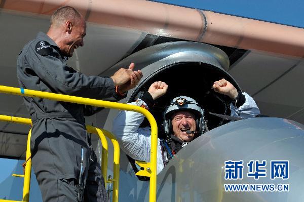 7月8日,在瑞士帕耶那机场,驾驶“太阳驱动”的该项目总裁、瑞士探险家安德烈·勃希伯格(右)与“太阳驱动”项目发起人、瑞士探险家贝特朗· 皮卡尔庆祝飞机首次昼夜试飞成功。世界最大太阳能飞机——瑞士制造的“太阳驱动”飞行26小时后,于当地时间8日9时在瑞士帕耶那机场降落,成功完成首次昼夜试飞。这是世界上首次进行太阳能飞机的夜间试飞。新华社/路透