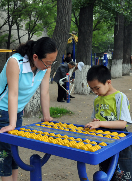 4.古城城墙外的街心公园里,母亲带着孩子练习传统的珠算。