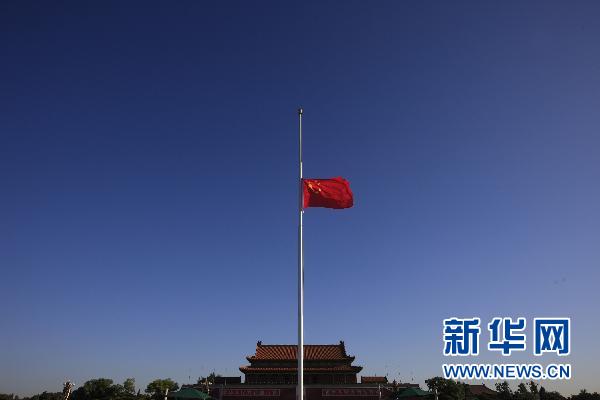 ???? 8月15日,北京天安门广场降下半旗,向甘肃舟曲特大山洪泥石流遇难同胞志哀。 新华社记者 任正来 摄