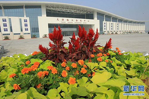 ??? 9月13日,天津夏季达沃斯论坛主会场梅江会展中心外的草坪花坛绿意盎然。世界经济论坛2010年新领军者年会(简称“夏季达沃斯论坛”)于9月13日至15日在天津召开。来自近90个国家和地区的1500多名与会者将共同探讨“推动可持续增长”这一主题。新华社记者 李明放 摄