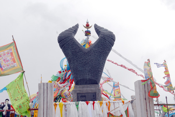 ?? 牛头碑位于青海玛多县鄂陵湖和扎陵湖之间海拔4610米的措哇尕则山山顶。1988年修建,纯铜铸造,高3米,宽2.8米。碑面刻有十世班禅大师和胡耀邦总书记题写的藏汉文“黄河源头”四个大字,纪念碑在造型上选用原始的图腾崇拜物——牛,作为中华文明古国和黄河子孙的化身,以牛角的粗犷、坚韧、有力象征着伟大坚强的中华民族精神。