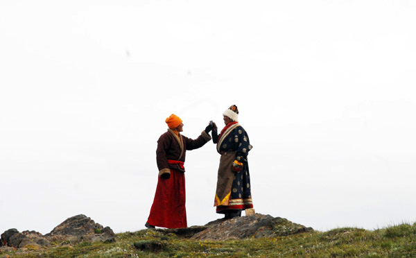 在黄河源头处祈祷祝福的一对藏族情侣。?