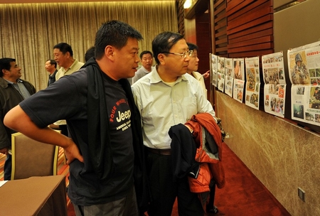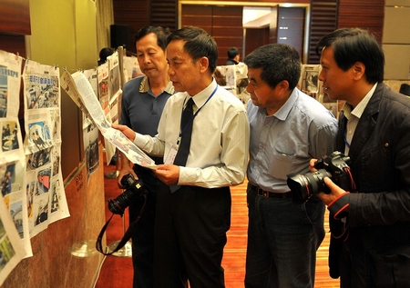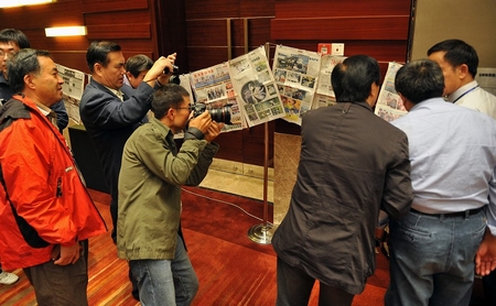 参会代表们欣赏各家媒体带来的报纸好版面。