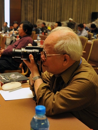 中国新闻摄影学会副主席江志顺将军(左二)点评报纸。